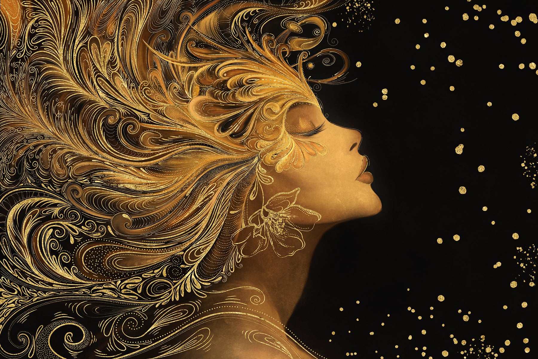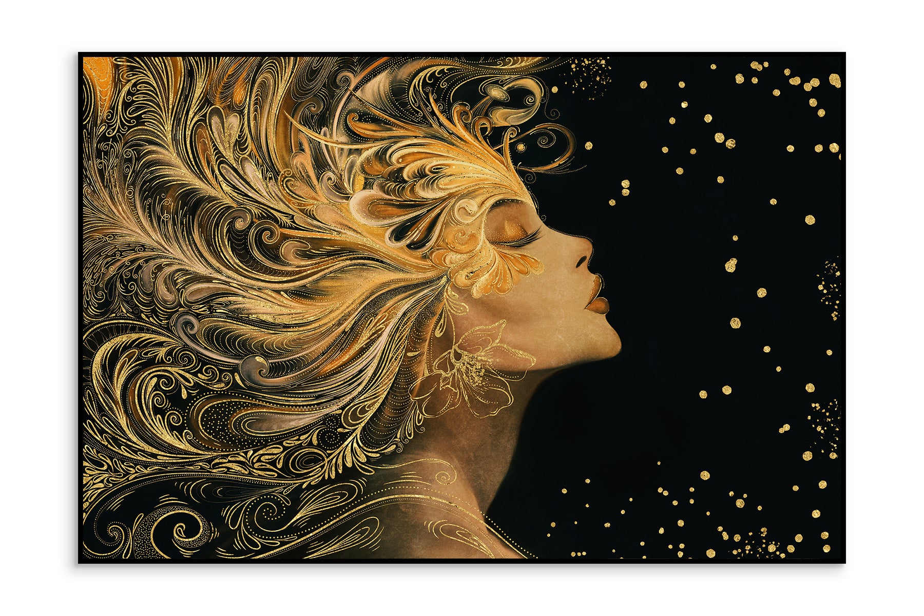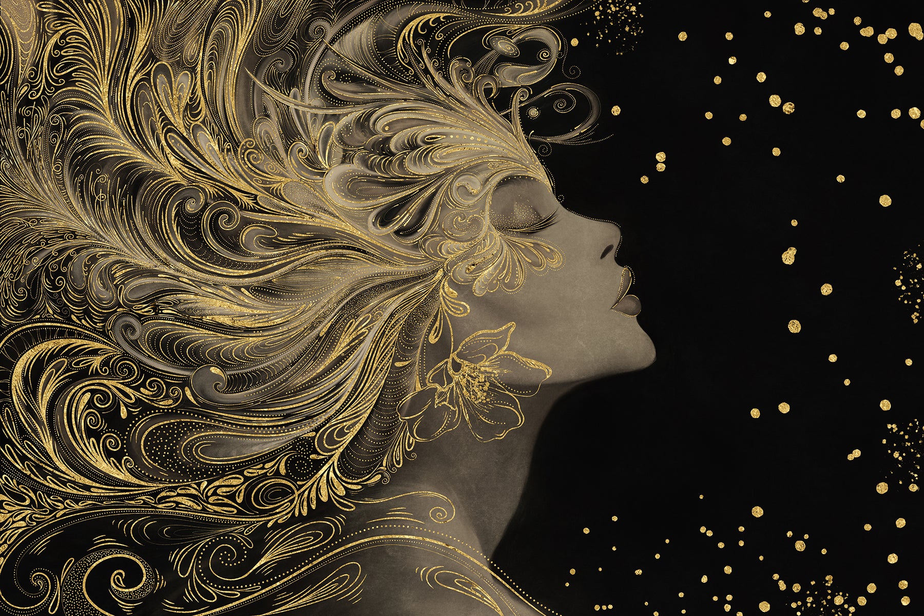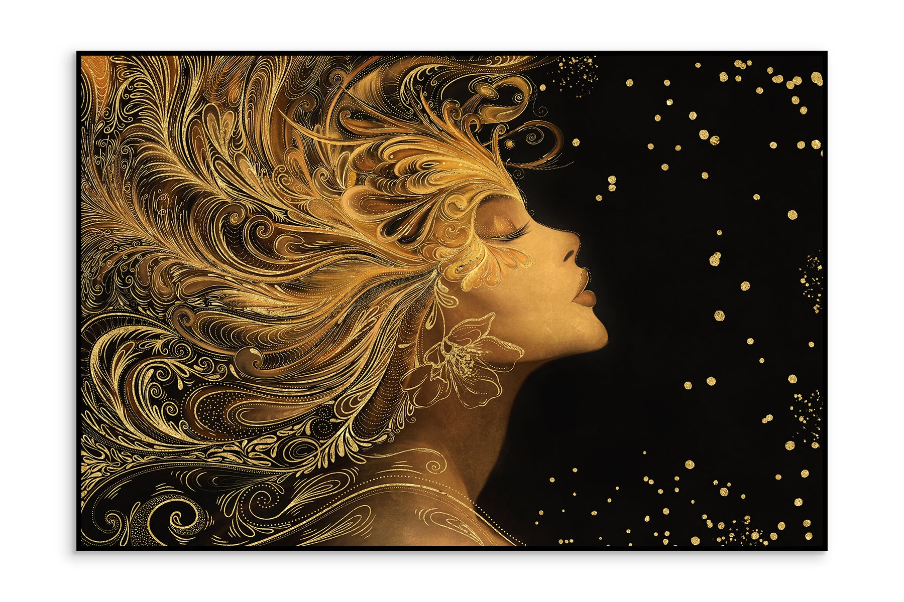 Auksiniu akcentu paveikslas „Auren“ – tai įspūdingas meno kūrinys, perteikiantis moters grožį, jėgą ir eleganciją. Šiame dizaine moters profilis atsiskleidžia tamsiame fone, o jos plaukai išsiskleidžia tarsi bangos, papuoštos sudėtingais auksiniais ornamentais. Kiekvienas judesys sustabdytas laike, o švytintys taškai ore suteikia kompozicijai magiškumo ir paslaptingumo.