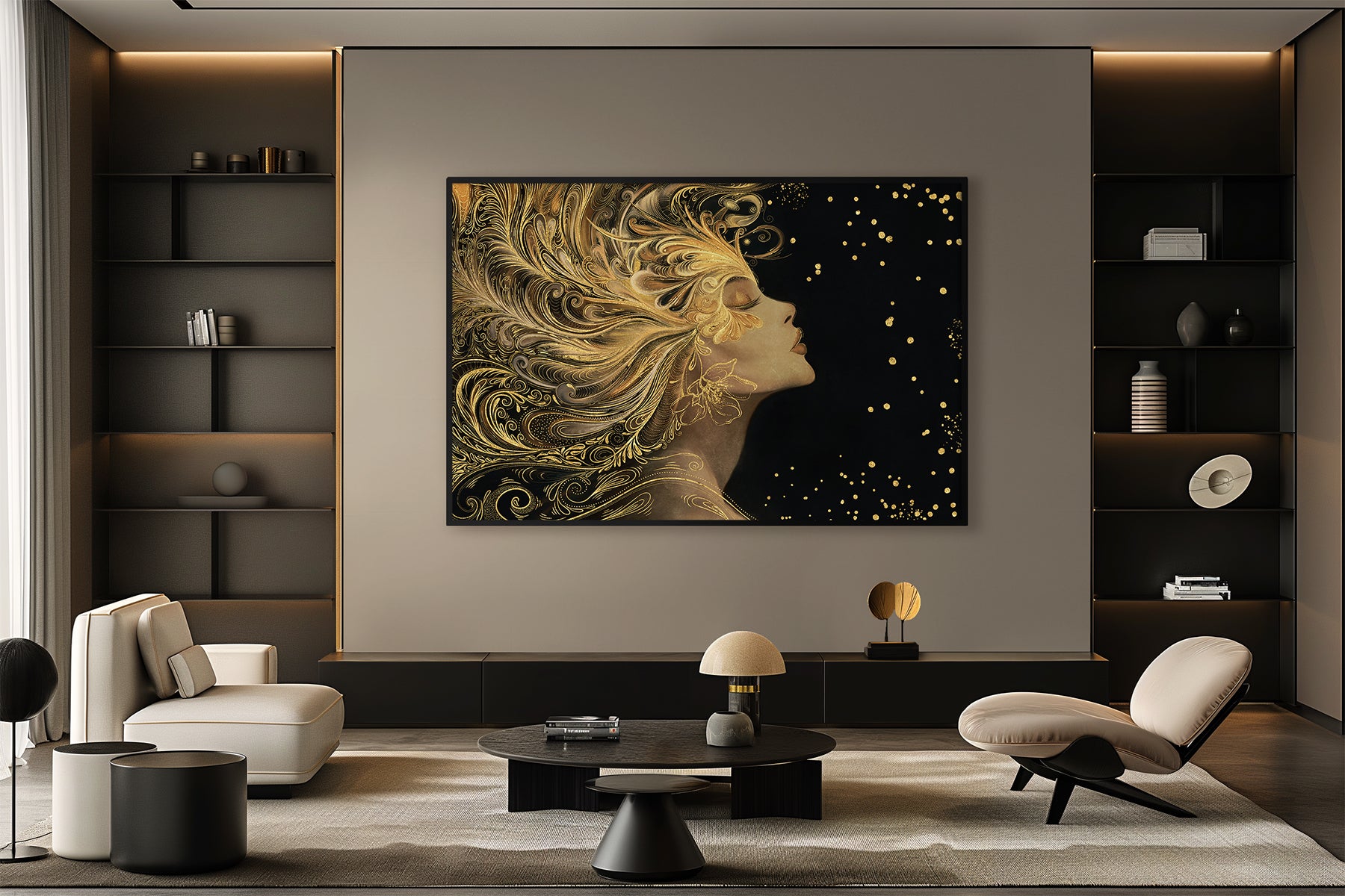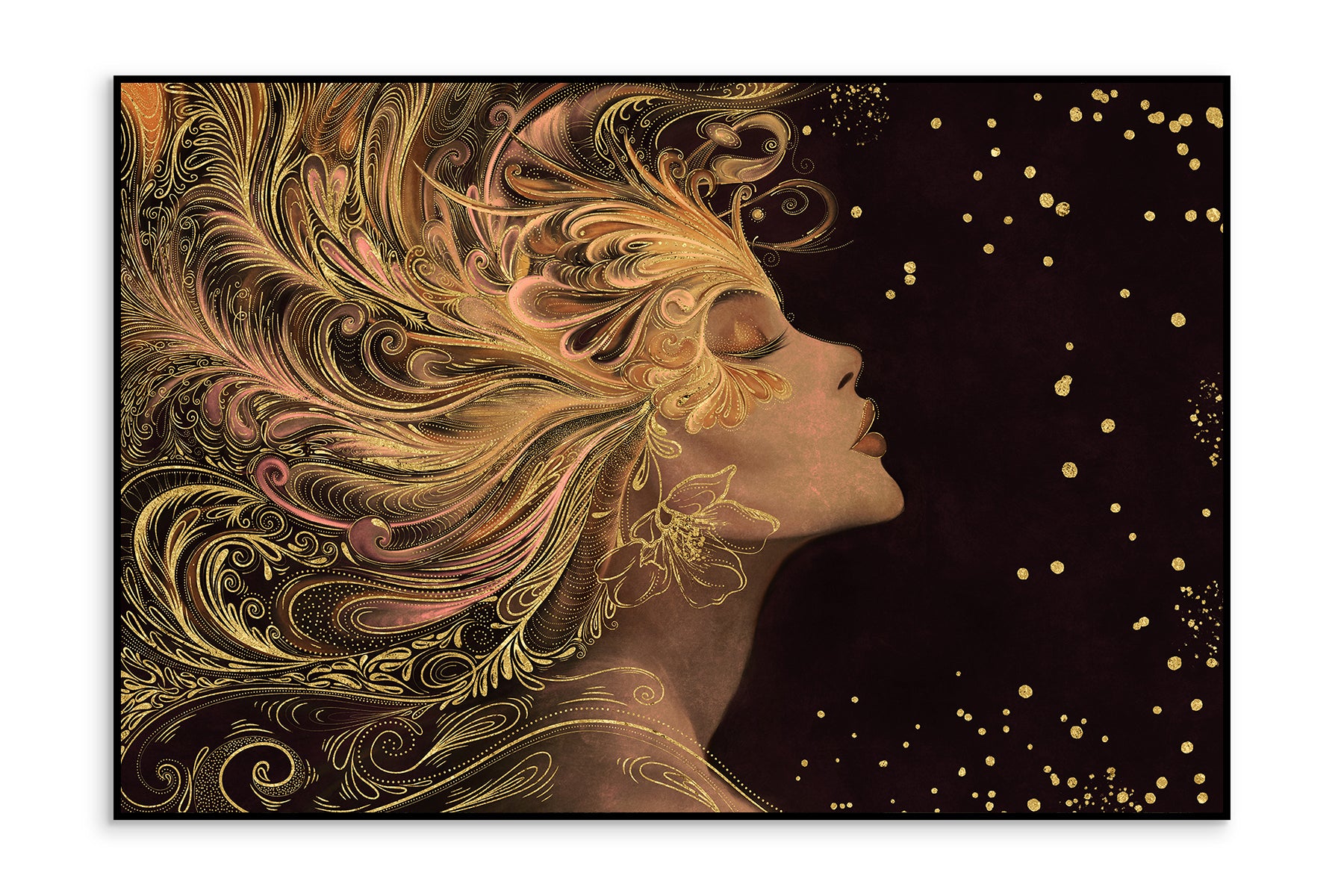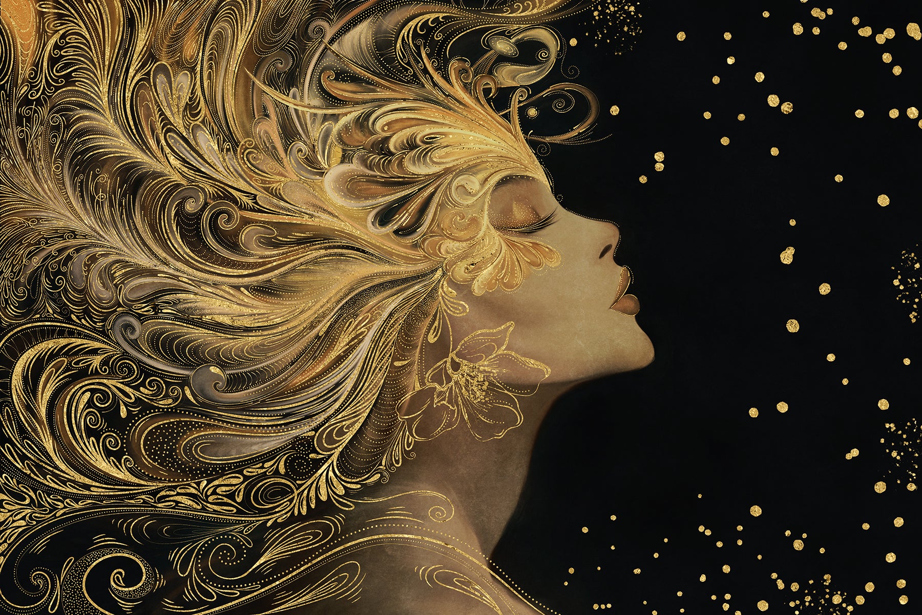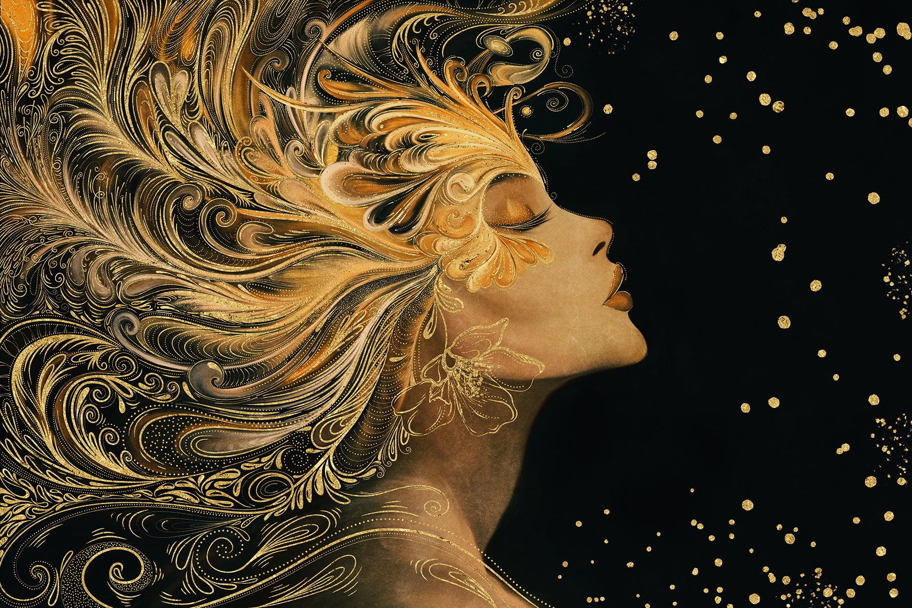 Auksiniu akcentu paveikslas „Auren“ – tai įspūdingas meno kūrinys, perteikiantis moters grožį, jėgą ir eleganciją. Šiame dizaine moters profilis atsiskleidžia tamsiame fone, o jos plaukai išsiskleidžia tarsi bangos, papuoštos sudėtingais auksiniais ornamentais. Kiekvienas judesys sustabdytas laike, o švytintys taškai ore suteikia kompozicijai magiškumo ir paslaptingumo.