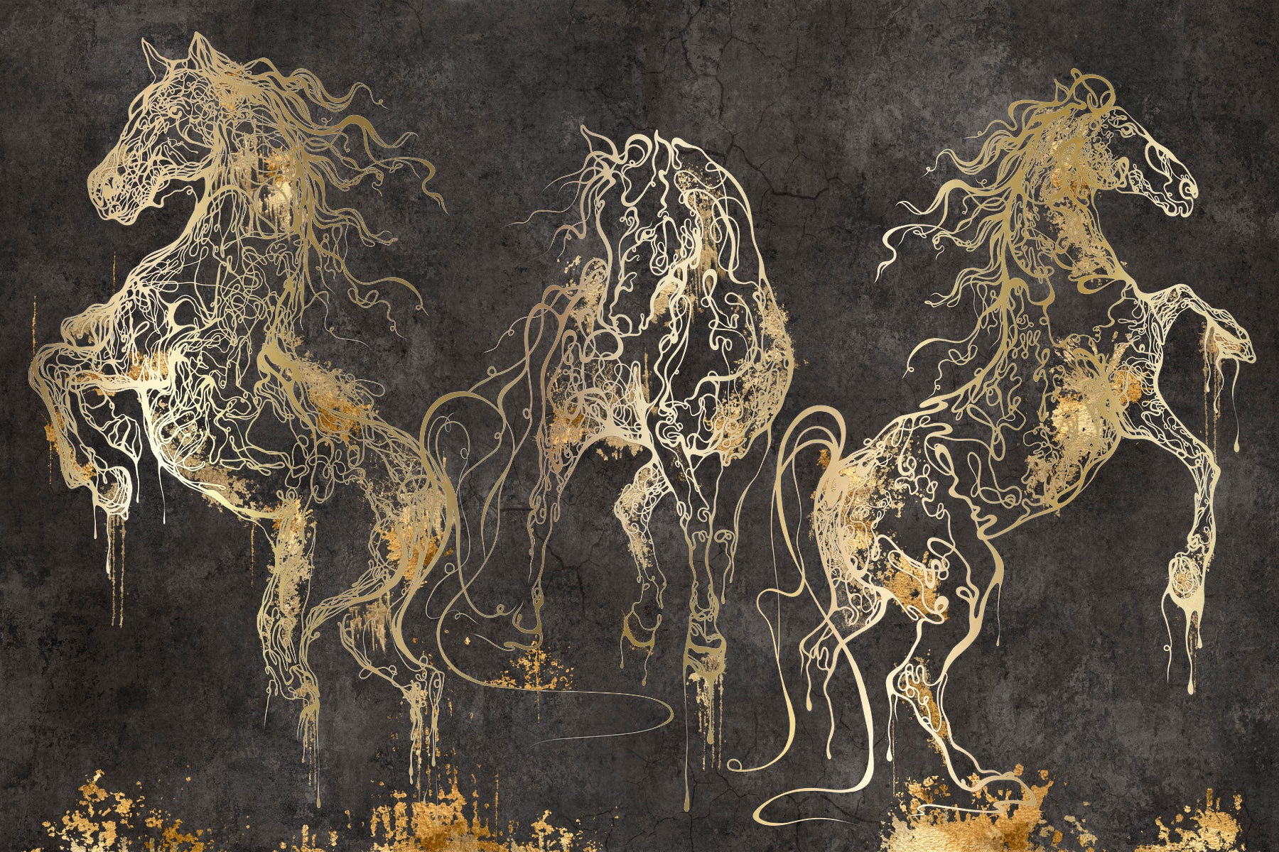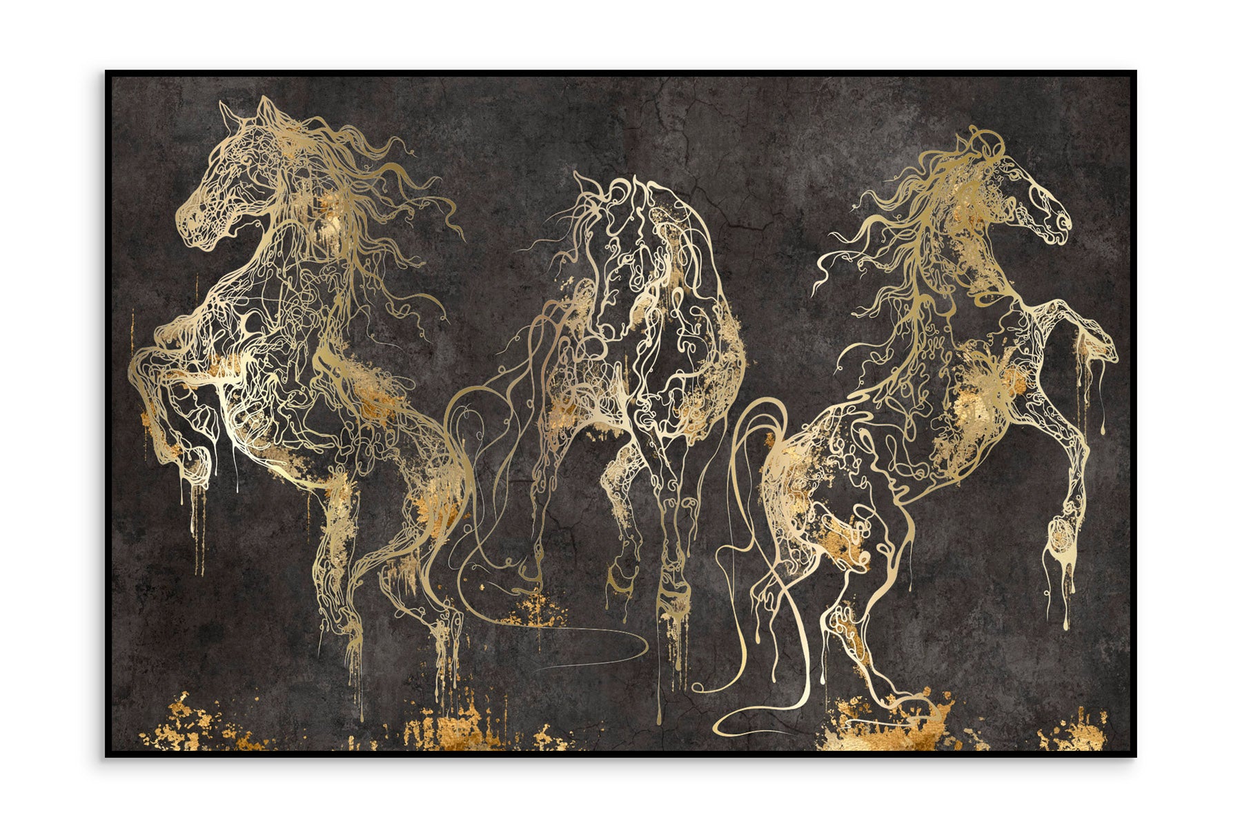Auksiniu akcentu paveikslas „Cavallo“ – tai įspūdingas meno kūrinys, vaizduojantis dinamiškus, judesyje įamžintus žirgus. Auksinės linijos išryškina jų formą tamsiame fone, sukurdamos elegancijos, galios ir laisvės jausmą. Šis kontrastingas ir emocionalus vaizdas perteikia jėgą bei judėjimą, tarsi žirgai būtų ką tik pabudę iš aukso dulkių debesies.