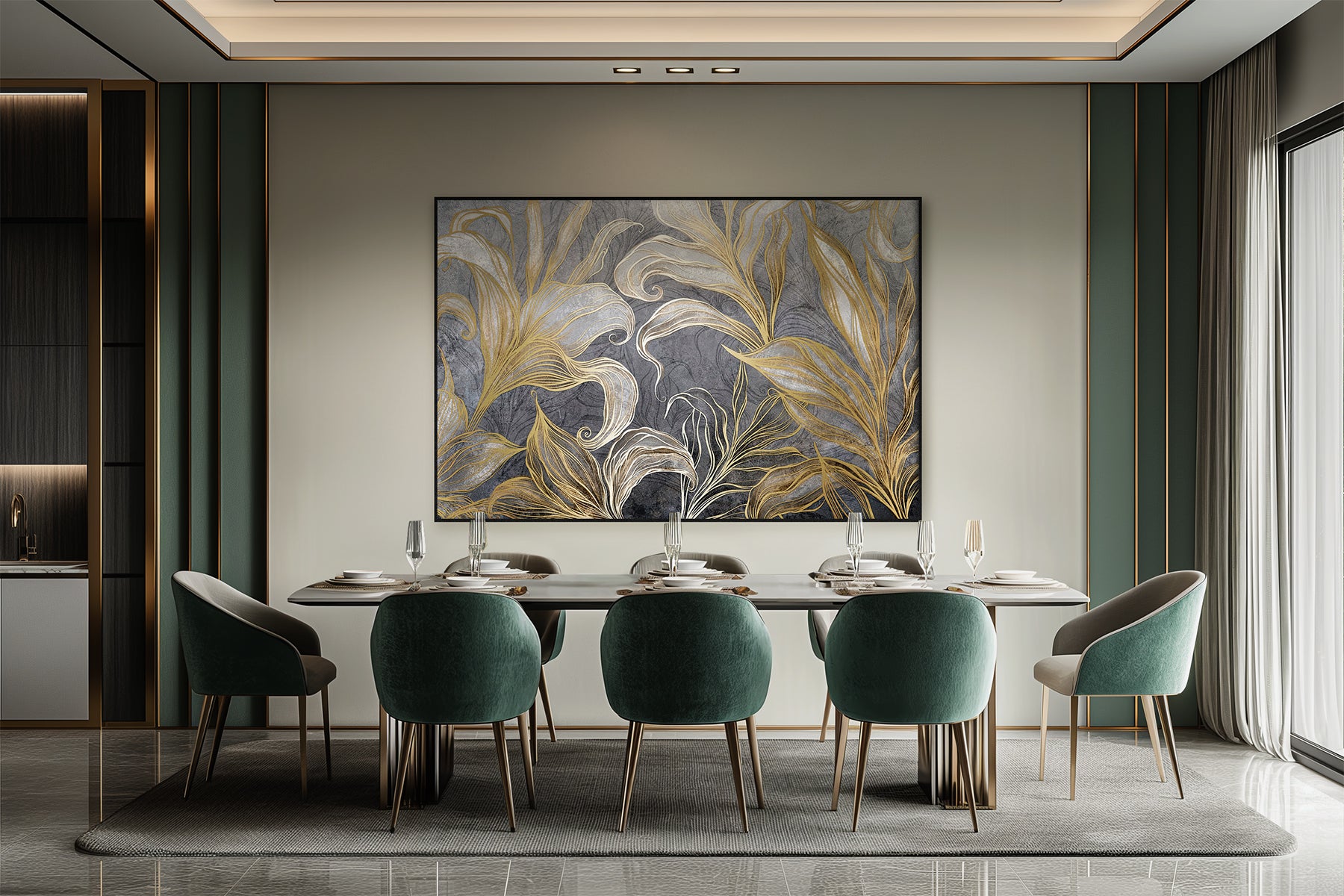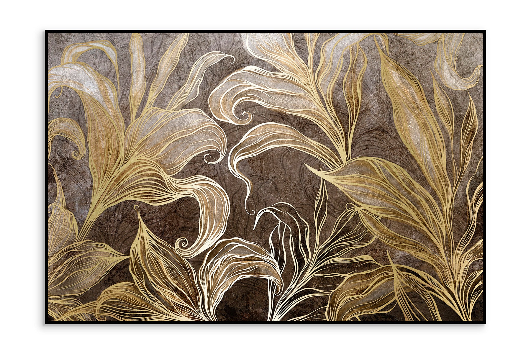 Auksiniu akcentu paveikslas „Ilia“ – tai elegantiškas ir modernus meno kūrinys, kuriame augaliniai motyvai subtiliai išreiškiami per aukso ir tamsių tonų kontrastą. Linijinis dizainas primena stilizuotus lapus ar bangas, švelniai tekančias per drobės paviršių.